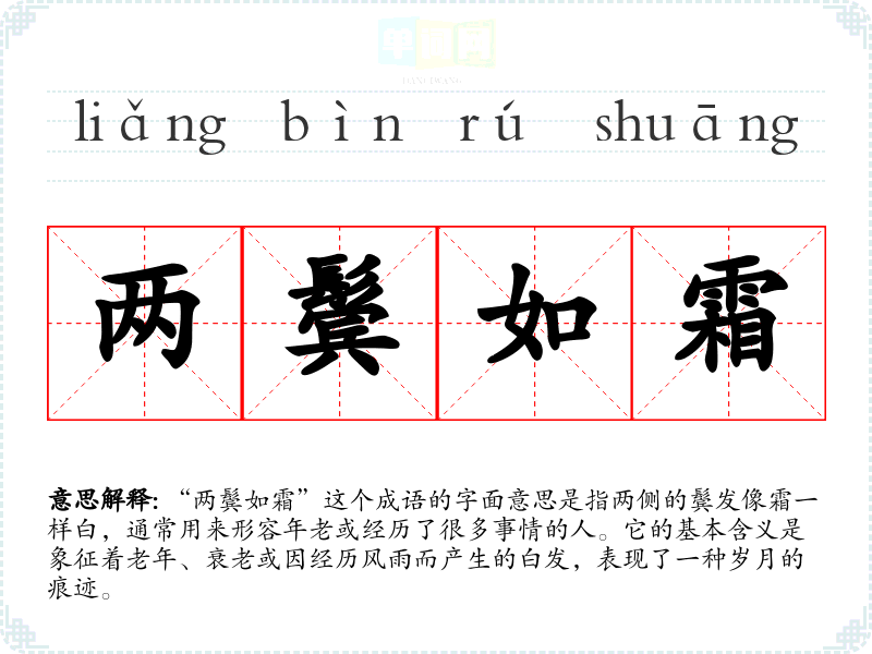 “两鬓如霜”这个成语的字面意思是指两侧的鬓发像霜一样白,通常用来形容年老或经历了很多事情的人。它的基本含义是象征着老年、衰老或因经历风雨而产生的白发,表现了一种岁月的痕迹。