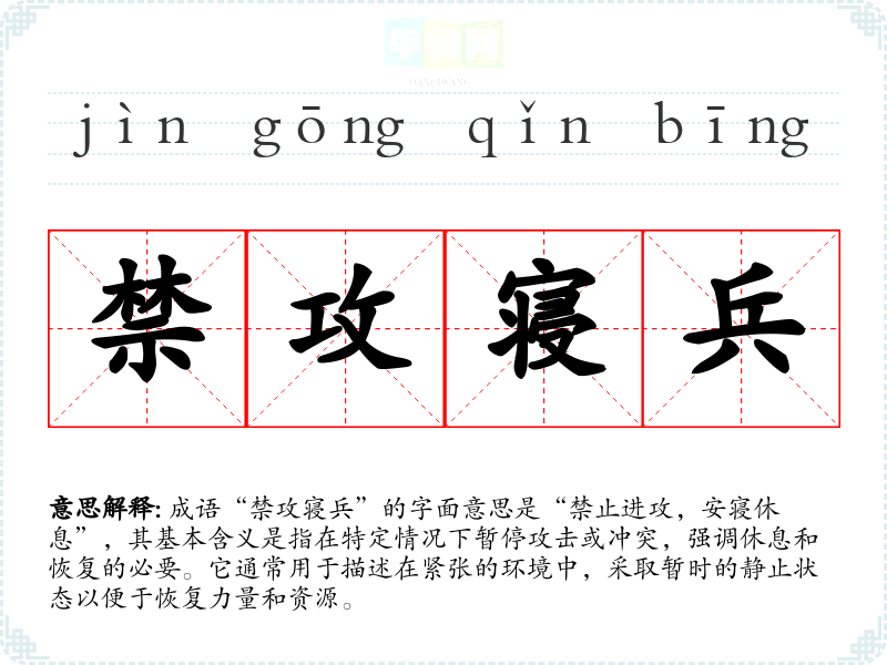 成语“禁攻寝兵”的字面意思是“禁止进攻,安寝休息”,其基本含义是指在特定情况下暂停攻击或冲突,强调休息和恢复的必要。它通常用于描述在紧张的环境中,采取暂时的静止状态以便于恢复力量和资源。
