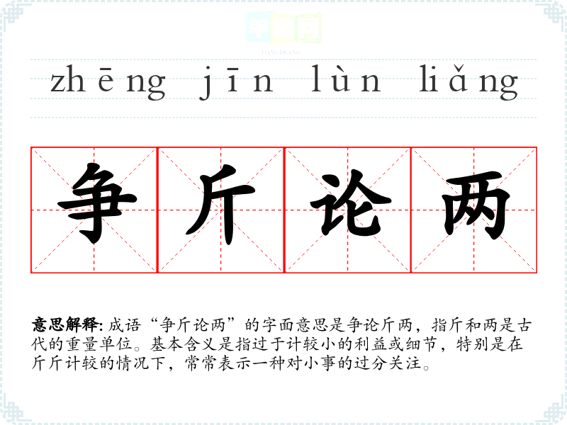 | 争斤论两 | 指在细枝末节上与人相争理论。 |