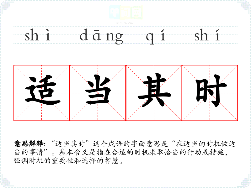 “适当其时”这个成语的字面意思是“在适当的时机做适当的事情”。基本含义是指在合适的时机采取恰当的行动或措施,强调时机的重要性和选择的智慧。
