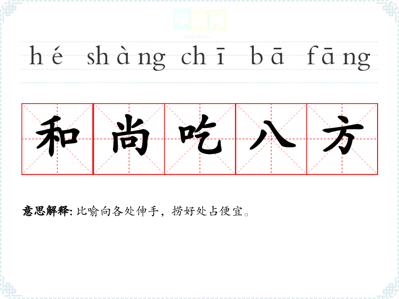 | 和尚吃八方 | 比喻向各处伸手,捞好处占便宜。 |
