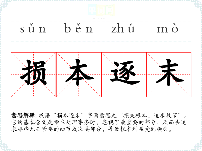 成语“损本逐末”字面意思是“损失根本,追求枝节”。它的基本含义是指在处理事务时,忽视了最重要的部分,反而去追求那些无关紧要的细节或次要部分,导致根本利益受到损失。