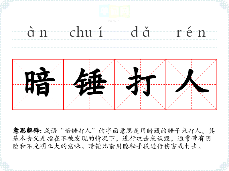 成语“暗锤打人”的字面意思是用暗藏的锤子来打人。其基本含义是指在不被发现的情况下,进行攻击或诋毁,通常带有阴险和不光明正大的意味。暗锤比喻用隐秘手段进行伤害或打击。