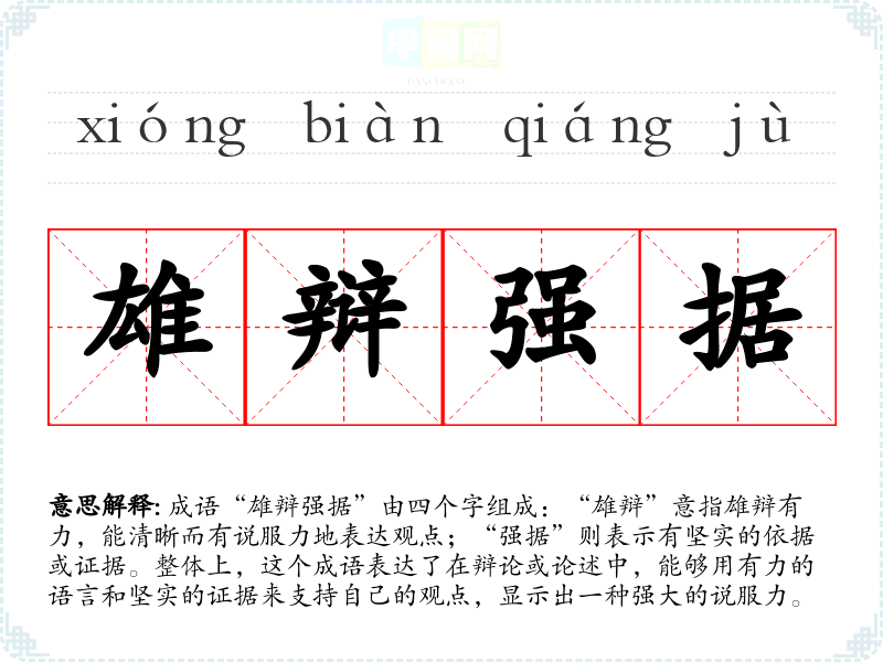 成语“雄辩强据”由四个字组成:“雄辩”意指雄辩有力,能清晰而有说服力地表达观点;“强据”则表示有坚实的依据或证据。整体上,这个成语表达了在辩论或论述中,能够用有力的语言和坚实的证据来支持自己的观点,显示出一种强大的说服力。