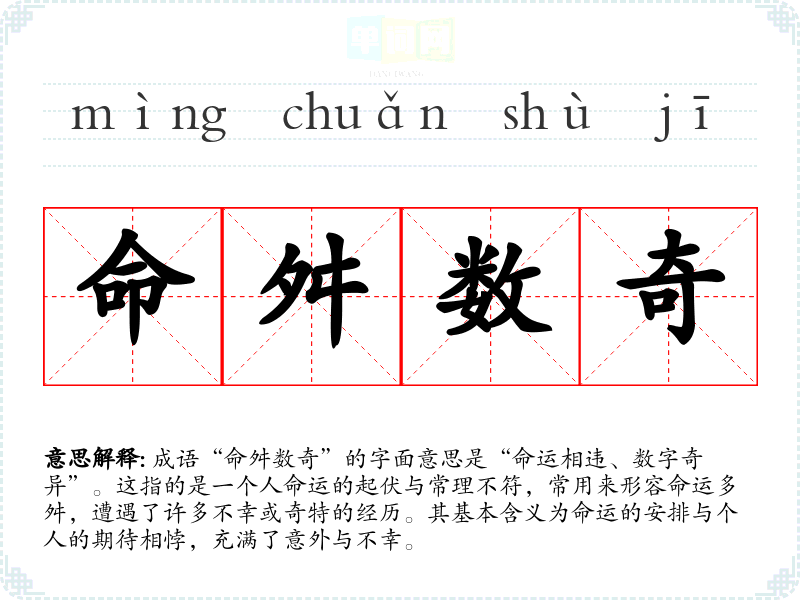 成语“命舛数奇”的字面意思是“命运相违、数字奇异”。这指的是一个人命运的起伏与常理不符,常用来形容命运多舛,遭遇了许多不幸或奇特的经历。其基本含义为命运的安排与个人的期待相悖,充满了意外与不幸。