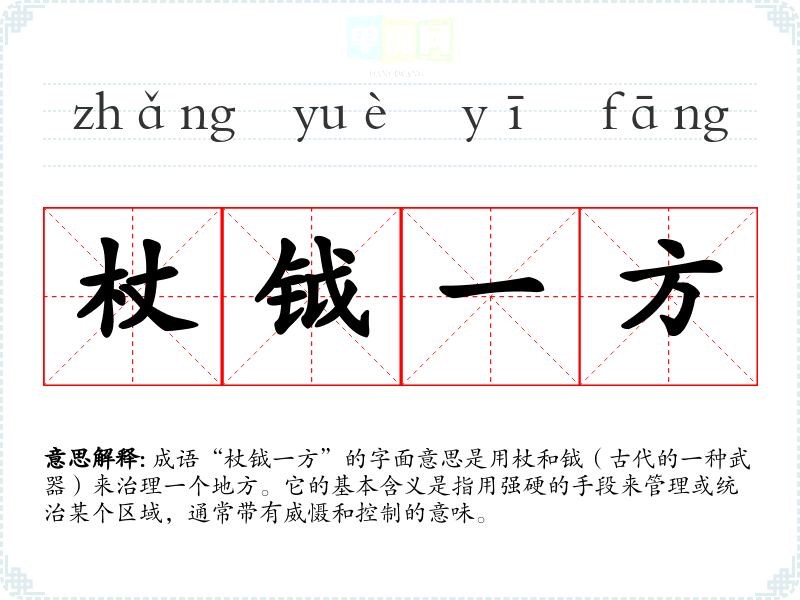 成语“杖钺一方”的字面意思是用杖和钺(古代的一种武器)来治理一个地方。它的基本含义是指用强硬的手段来管理或统治某个区域,通常带有威慑和控制的意味。