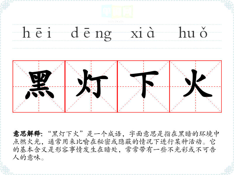 在我的生活中,我曾经在工作中发现一些同事在私下里进行一些不正当的交易,这让我想起了“黑灯下火”,这种隐秘的行为让我感到不安。我在讨论这个问题时,使用了这个成语,帮助我更准确地表达我的担忧。