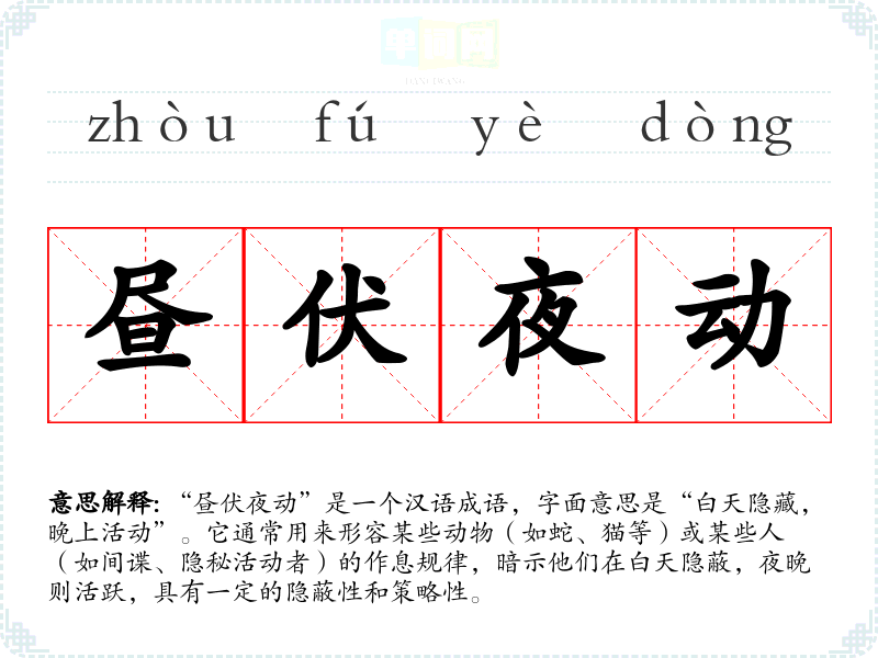 - 文学作品:作家可以用“昼伏夜动”来形容角色的隐秘活动,增加故事的悬疑感。