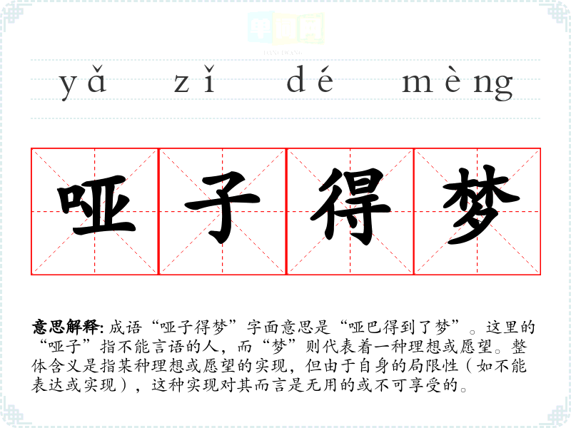 - 梦想成真:表示理想得以实现,正好与“哑子得梦”形成对比。