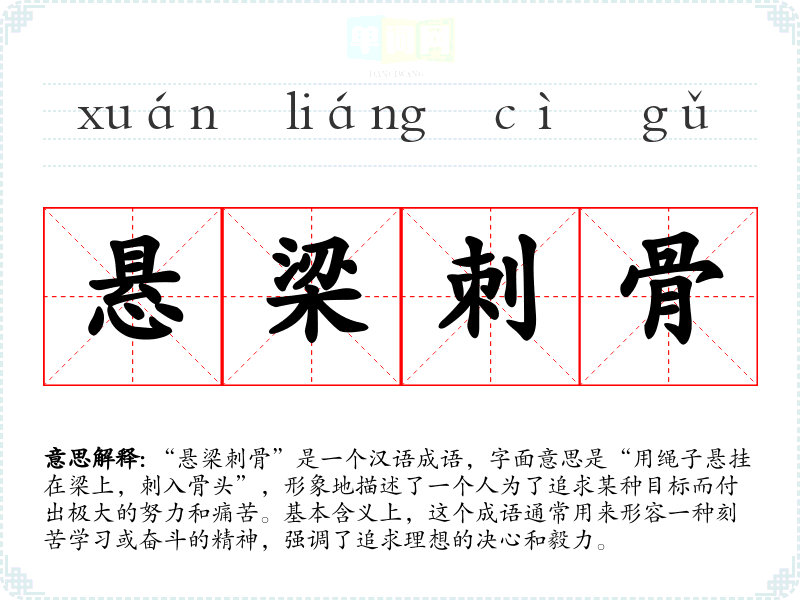 “悬梁刺骨”是一个汉语成语,字面意思是“用绳子悬挂在梁上,刺入骨头”,形象地描述了一个人为了追求某种目标而付出极大的努力和痛苦。基本含义上,这个成语通常用来形容一种刻苦学*或奋斗的精神,强调了追求理想的决心和毅力。