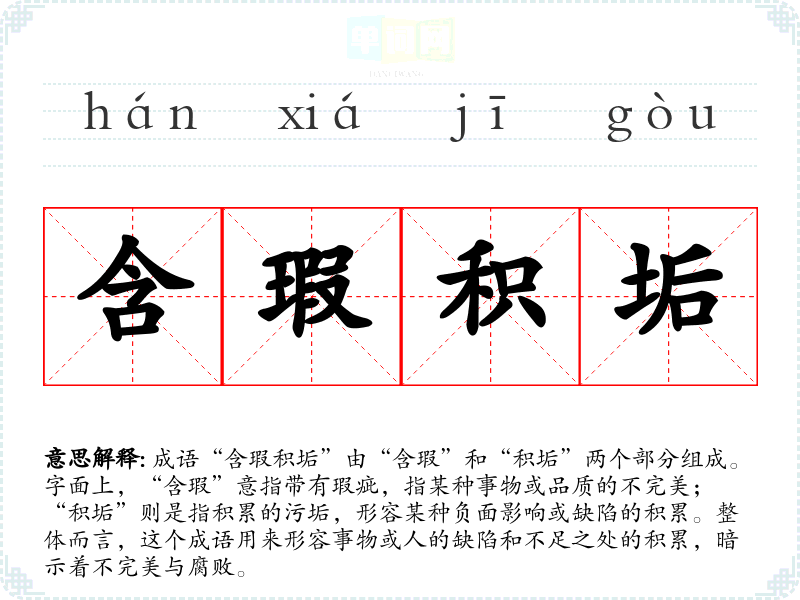 成语“含瑕积垢”由“含瑕”和“积垢”两个部分组成。字面上,“含瑕”意指带有瑕疵,指某种事物或品质的不完美;“积垢”则是指积累的污垢,形容某种负面影响或缺陷的积累。整体而言,这个成语用来形容事物或人的缺陷和不足之处的积累,暗示着不完美与腐败。