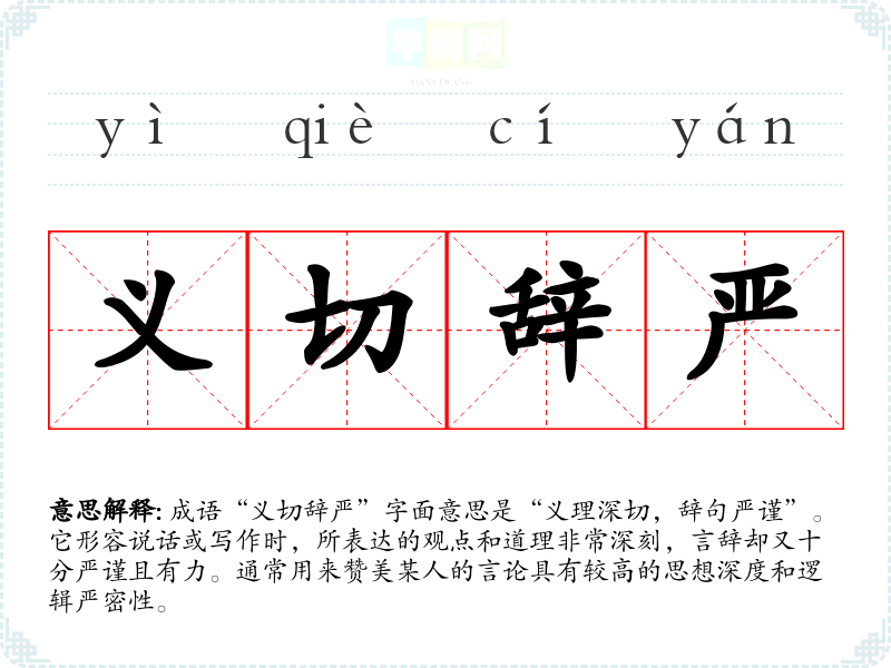 成语“义切辞严”字面意思是“义理深切,辞句严谨”。它形容说话或写作时,所表达的观点和道理非常深刻,言辞却又十分严谨且有力。通常用来赞美某人的言论具有较高的思想深度和逻辑严密性。