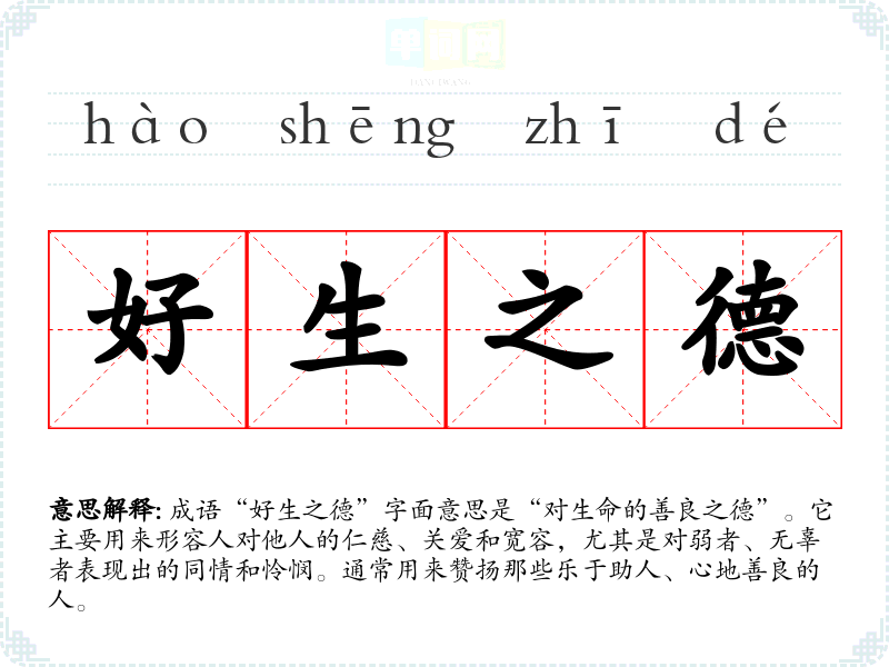 成语“好生之德”字面意思是“对生命的善良之德”。它主要用来形容人对他人的仁慈、关爱和宽容,尤其是对弱者、无辜者表现出的同情和怜悯。通常用来赞扬那些乐于助人、心地善良的人。