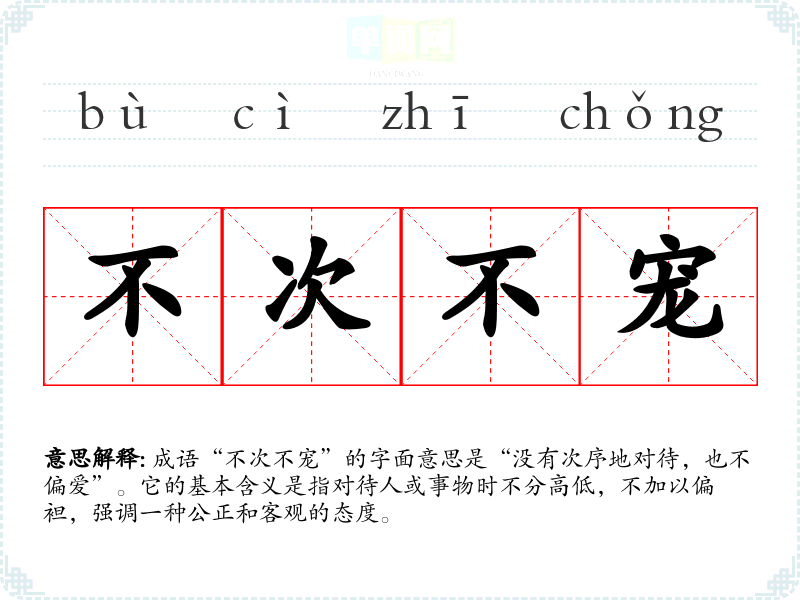 成语“不次不宠”的字面意思是“没有次序地对待,也不偏爱”。它的基本含义是指对待人或事物时不分高低,不加以偏袒,强调一种公正和客观的态度。
