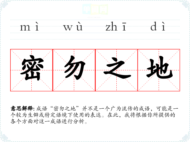 成语“密勿之地”并不是一个广为流传的成语,可能是一个较为生僻或特定语境下使用的表达。在此,我将根据你所提供的各个方面对这一成语进行分析。