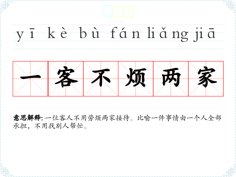 | 一客不烦两家 | 一位客人不用劳烦两家接待。比喻一件事情由一个人全部承担,不用找别人帮忙。 |