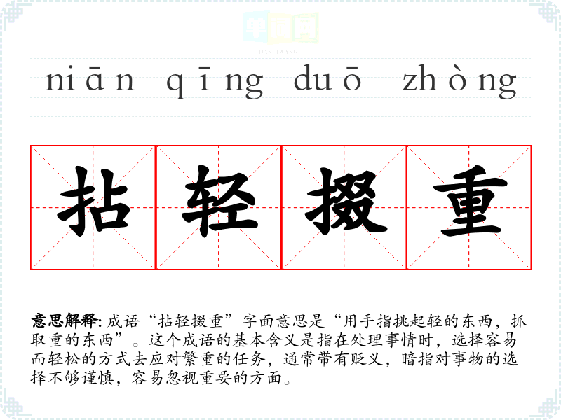 成语“拈轻掇重”字面意思是“用手指挑起轻的东西,抓取重的东西”。这个成语的基本含义是指在处理事情时,选择容易而轻松的方式去应对繁重的任务,通常带有贬义,暗指对事物的选择不够谨慎,容易忽视重要的方面。