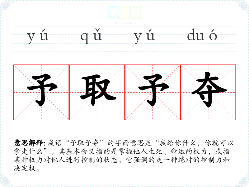 成语“予取予夺”的字面意思是“我给你什么,你就可以拿走什么”。其基本含义指的是掌握他人生死、命运的权力,或指某种权力对他人进行控制的状态。它强调的是一种绝对的控制力和决定权。