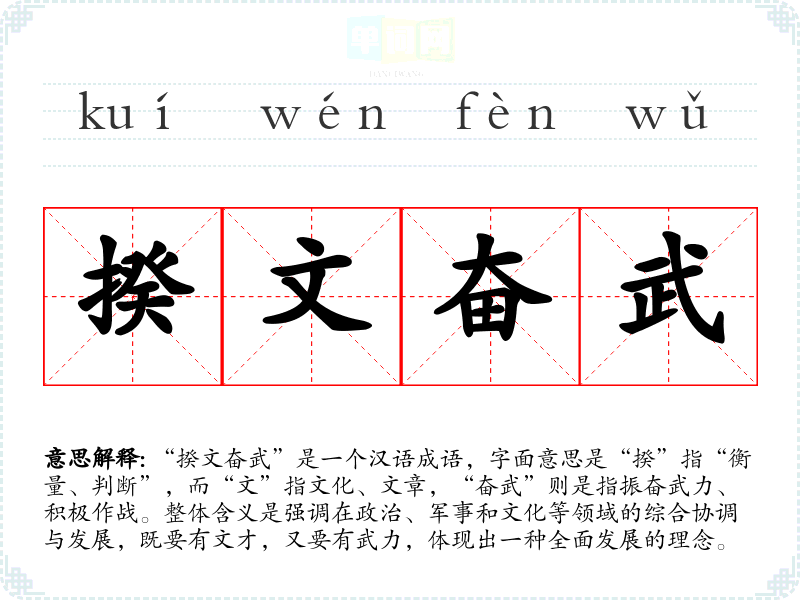 “揆文奋武”是一个汉语成语,字面意思是“揆”指“衡量、判断”,而“文”指文化、文章,“奋武”则是指振奋武力、积极作战。整体含义是强调在政治、军事和文化等领域的综合协调与发展,既要有文才,又要有武力,体现出一种全面发展的理念。