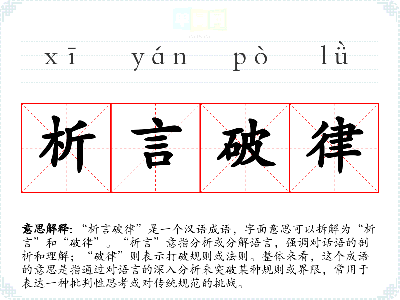“析言破律”是一个汉语成语,字面意思可以拆解为“析言”和“破律”。“析言”意指分析或分解语言,强调对话语的剖析和理解;“破律”则表示打破规则或法则。整体来看,这个成语的意思是指通过对语言的深入分析来突破某种规则或界限,常用于表达一种批判性思考或对传统规范的挑战。