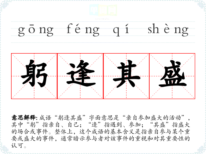 成语“躬逢其盛”字面意思是“亲自参加盛大的活动”,其中“躬”指亲自、自己;“逢”指遇到、参加;“其盛”指盛大的场合或。整体上,这个成语的基本含义是指亲自参与某个重要或盛大的,通常暗示参与者对该**的重视和对其重要性的认可。