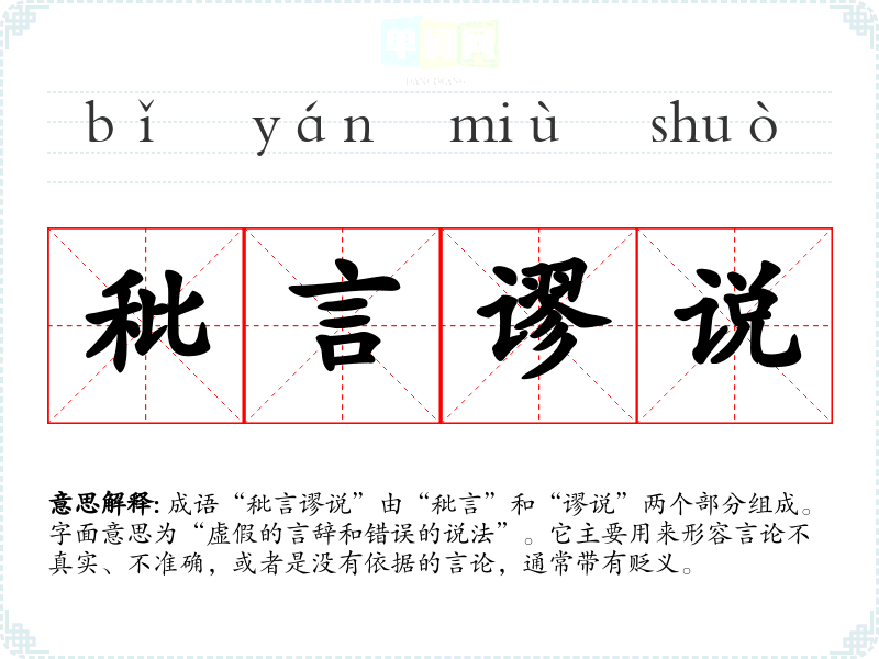 成语“秕言谬说”由“秕言”和“谬说”两个部分组成。字面意思为“虚假的言辞和错误的说法”。它主要用来形容言论不真实、不准确,或者是没有依据的言论,通常带有贬义。