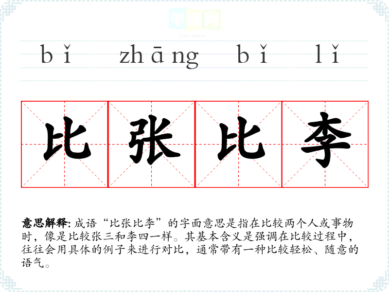 成语“比张比李”的字面意思是指在比较两个人或事物时,像是比较张三和李四一样。其基本含义是强调在比较过程中,往往会用具体的例子来进行对比,通常带有一种比较轻松、随意的语气。
