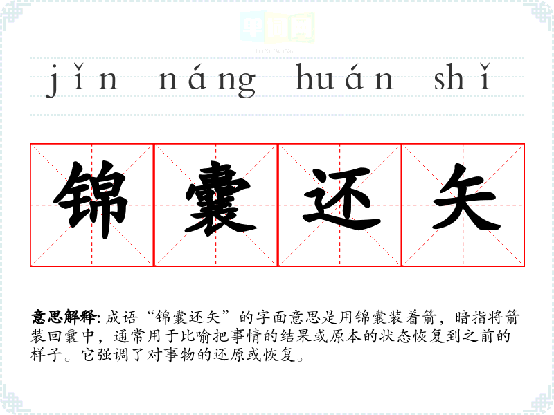 成语“锦囊还矢”的字面意思是用锦囊装着箭,暗指将箭装回囊中,通常用于比喻把事情的结果或原本的状态恢复到之前的样子。它强调了对事物的还原或恢复。