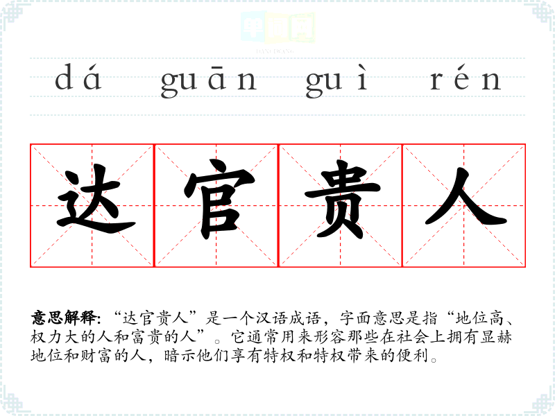 “达官贵人”是一个汉语成语,字面意思是指“地位高、权力大的人和富贵的人”。它通常用来形容那些在社会上拥有显赫地位和财富的人,暗示他们享有特权和特权带来的便利。