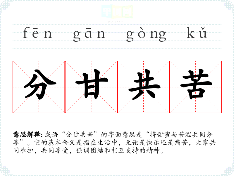 成语“分甘共苦”的字面意思是“将甜蜜与苦涩共同分享”。它的基本含义是指在生活中,无论是快乐还是痛苦,大家共同承担,共同享受,强调团结和相互支持的精神。