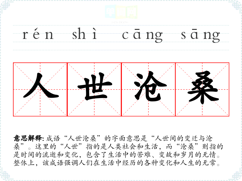 成语“人世沧桑”的字面意思是“人世间的变迁与沧桑”。这里的“人世”指的是人类社会和生活,而“沧桑”则指的是时间的流逝和变化,包含了生活中的苦难、变故和岁月的无情。整体上,该成语强调人们在生活中经历的各种变化和人生的无常。