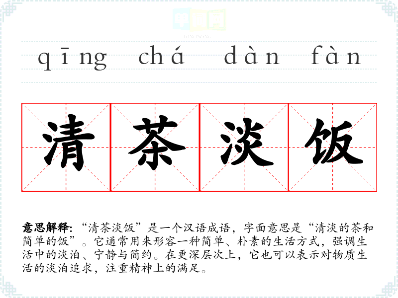 “清茶淡饭”是一个汉语成语,字面意思是“清淡的茶和简单的饭”。它通常用来形容一种简单、朴素的生活方式,强调生活中的淡泊、宁静与简约。在更深层次上,它也可以表示对物质生活的淡泊追求,注重精神上的满足。