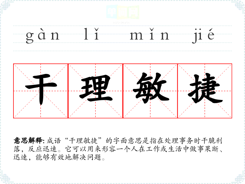 | 干理敏捷 | 干理:管理,处理事情。处理事情迅速、果断。 |