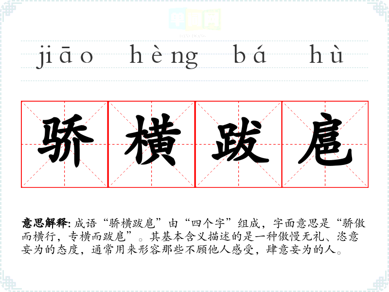 成语“骄横跋扈”由“四个字”组成,字面意思是“骄傲而横行,专横而跋扈”。其基本含义描述的是一种傲慢无礼、恣意妄为的态度,通常用来形容那些不顾他人感受,肆意妄为的人。