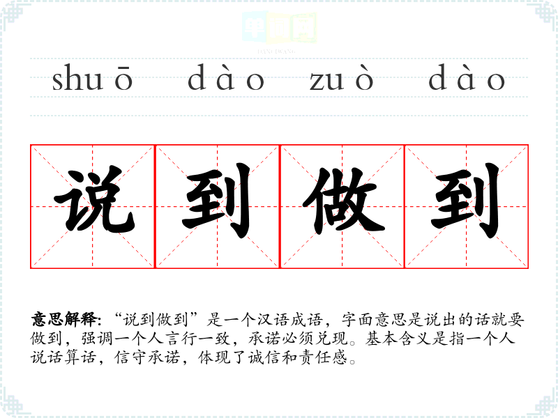 通过对“说到做到”的学,我更加认识到诚信的重要性,它不仅是个人品德的体现,也是社会和谐与商业成功的基础。在语言学和表达中,使用这样的成语可以让交流更加生动和有力。