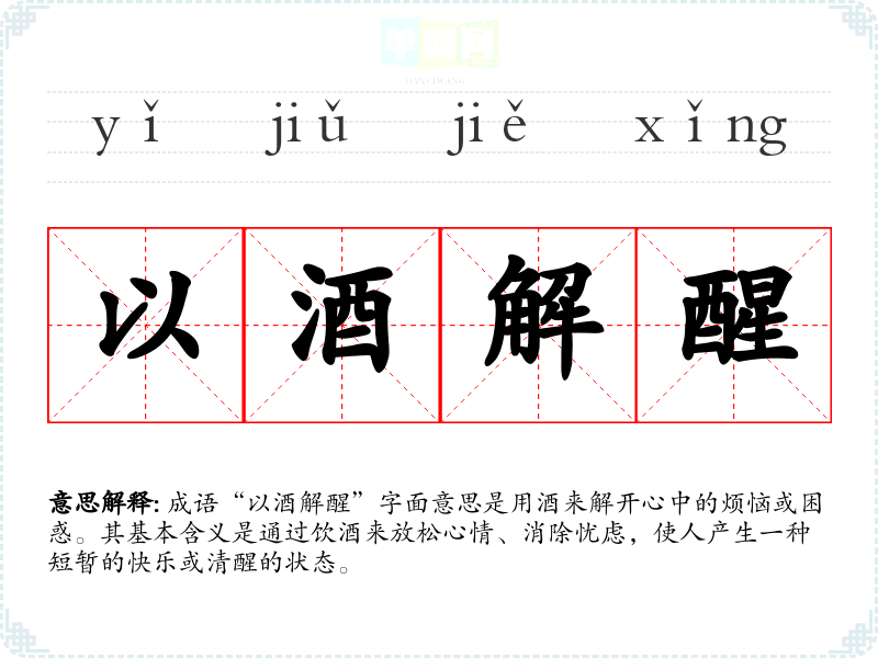 成语“以酒解醒”字面意思是用酒来解开心中的烦恼或困惑。其基本含义是通过饮酒来放松心情、消除忧虑,使人产生一种短暂的快乐或清醒的状态。