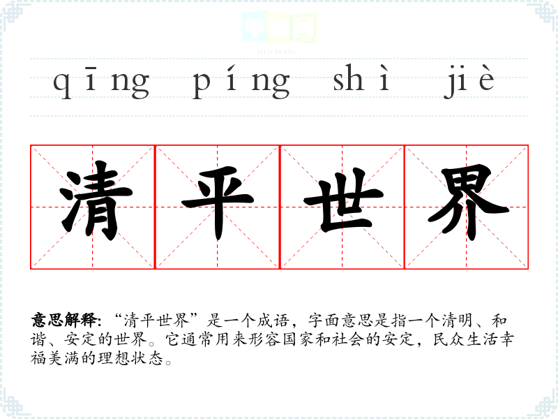 “清平世界”是一个成语,字面意思是指一个清明、和谐、安定的世界。它通常用来形容国家和社会的安定,民众生活幸福美满的理想状态。