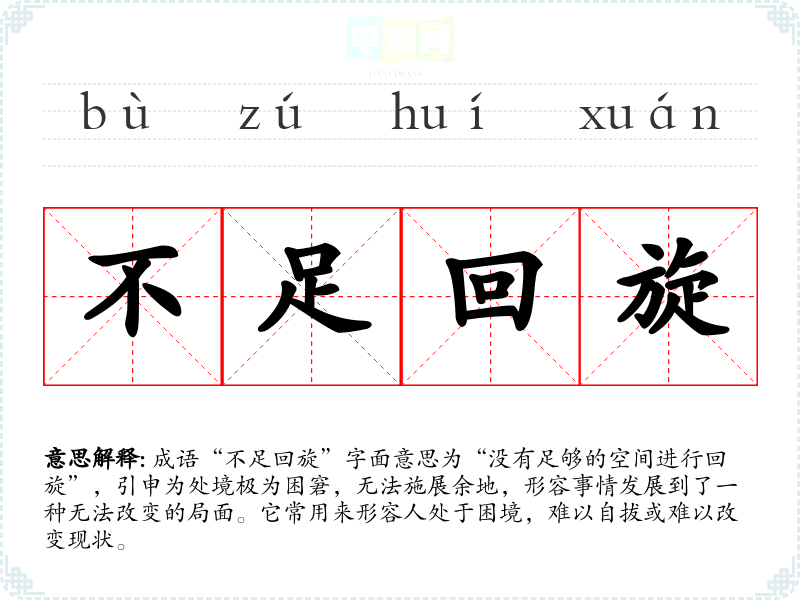 成语“不足回旋”字面意思为“没有足够的空间进行回旋”,引申为处境极为困窘,无法施展余地,形容事情发展到了一种无法改变的局面。它常用来形容人处于困境,难以自拔或难以改变现状。