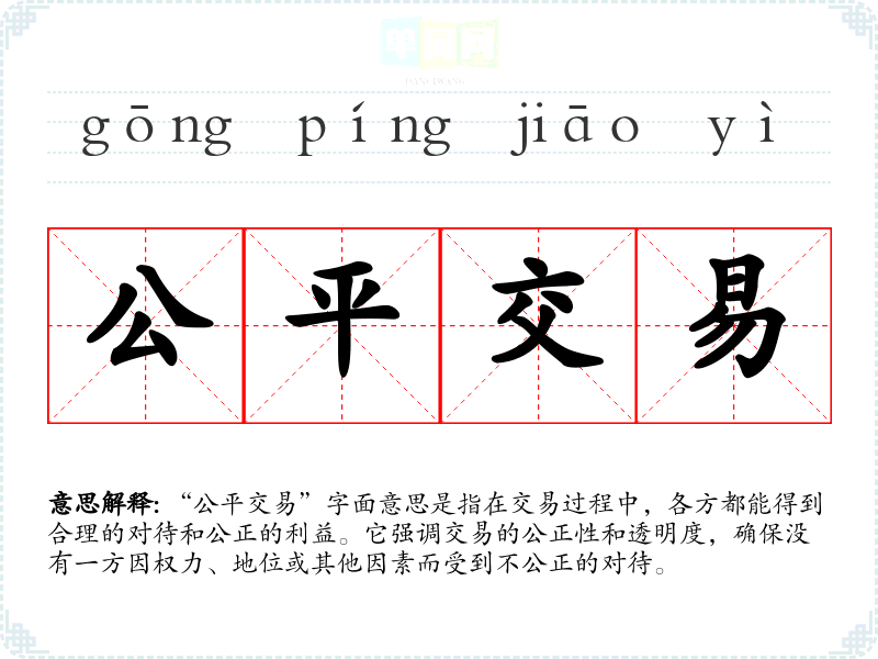 “公平交易”字面意思是指在交易过程中,各方都能得到合理的对待和公正的利益。它强调交易的公正性和透明度,确保没有一方因权力、地位或其他因素而受到不公正的对待。