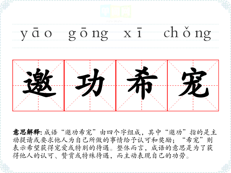 成语“邀功希宠”由四个字组成,其中“邀功”指的是主动提请或要求他人为自己所做的事情给予认可和奖励;“希宠”则表示希望获得宠爱或特别的待遇。整体而言,成语的意思是为了获得他人的认可、赞赏或特殊待遇,而主动表现自己的功劳。