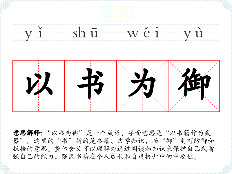 “以书为御”是一个成语,字面意思是“以书籍作为武器”。这里的“书”指的是书籍、文学知识,而“御”则有防御和抵挡的意思。整体含义可以理解为通过阅读和知识来保护自己或增强自己的能力,强调书籍在个人成长和自我提升中的重要性。
