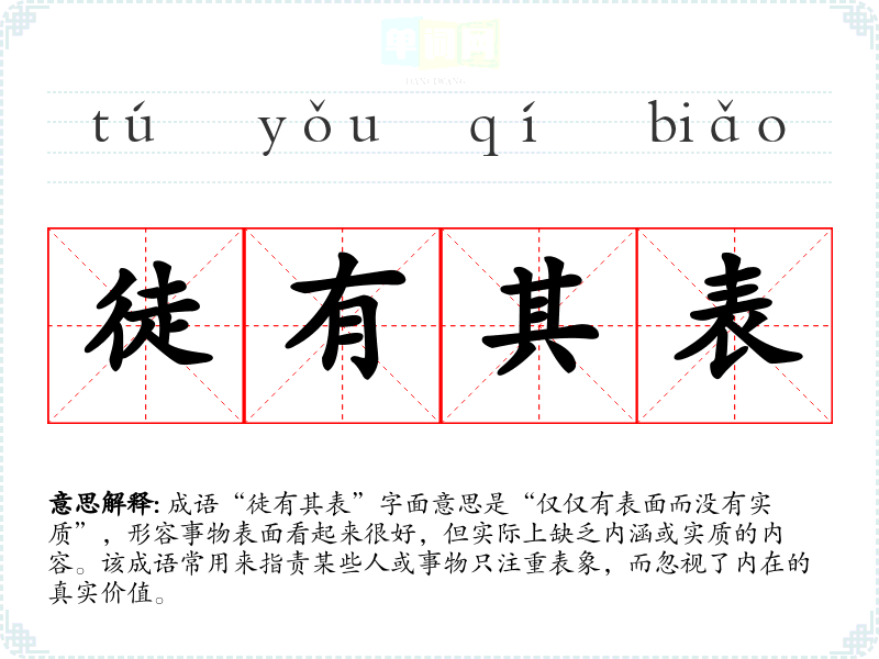 成语“徒有其表”字面意思是“仅仅有表面而没有实质”,形容事物表面看起来很好,但实际上缺乏内涵或实质的内容。该成语常用来指责某些人或事物只注重表象,而忽视了内在的真实价值。