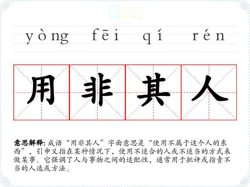 成语“用非其人”字面意思是“使用不属于这个人的东西”,引申义指在某种情况下,使用不适合的人或不适当的方式来做某事。它强调了人与事物之间的适配性,通常用于批评或指责不当的人选或方法。