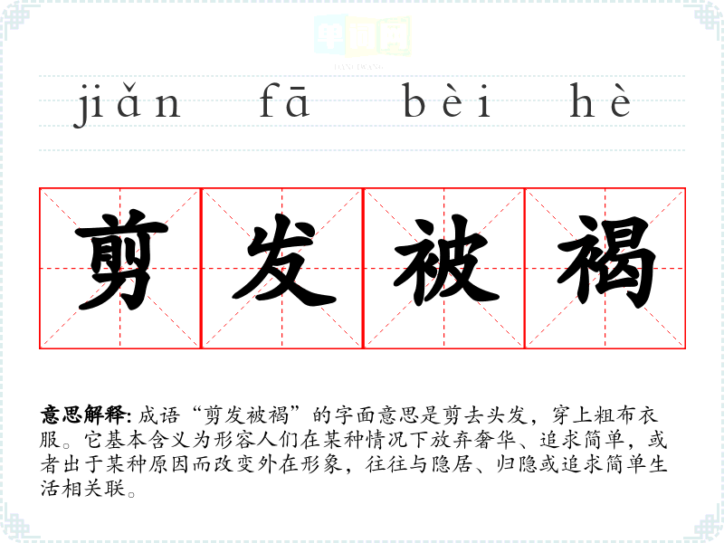 成语“剪发被褐”的字面意思是剪去头发,穿上粗布衣服。它基本含义为形容人们在某种情况下放弃奢华、追求简单,或者出于某种原因而改变外在形象,往往与隐居、归隐或追求简单生活相关联。