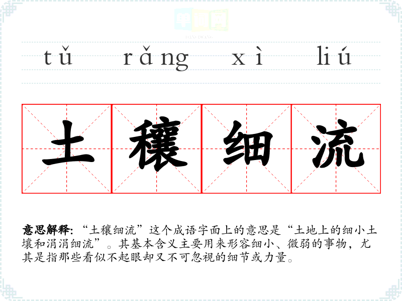 “土穰细流”这个成语字面上的意思是“土地上的细小土壤和涓涓细流”。其基本含义主要用来形容细小、微弱的事物,尤其是指那些看似不起眼却又不可忽视的细节或力量。
