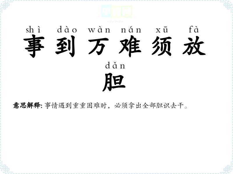 | 事到万难须放胆 | 事情遇到重重困难时,必须拿出全部胆识去干。 |