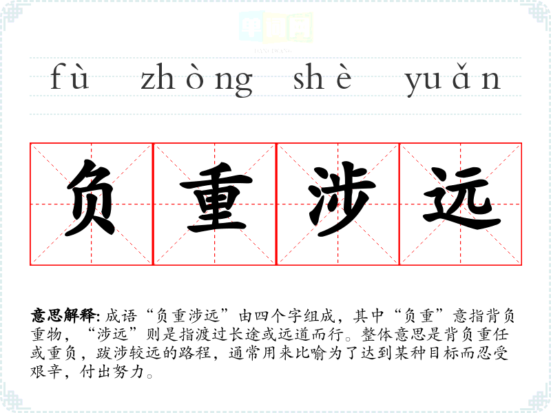 成语“负重涉远”由四个字组成,其中“负重”意指背负重物,“涉远”则是指渡过长途或远道而行。整体意思是背负重任或重负,跋涉较远的路程,通常用来比喻为了达到某种目标而忍受艰辛,付出努力。