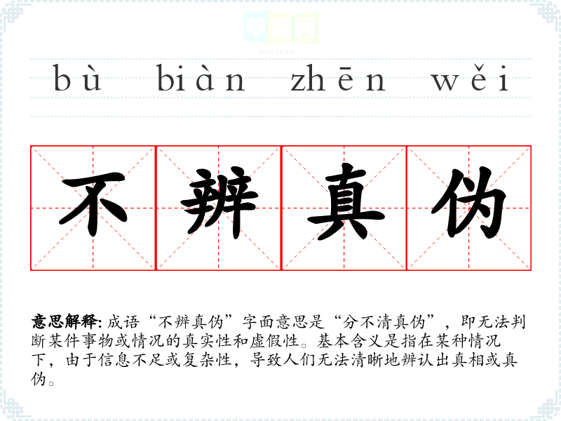 成语“不辨真伪”字面意思是“分不清真伪”,即无法判断某件事物或情况的真实性和虚假性。基本含义是指在某种情况下,由于信息不足或复杂性,导致人们无法清晰地辨认出真相或真伪。