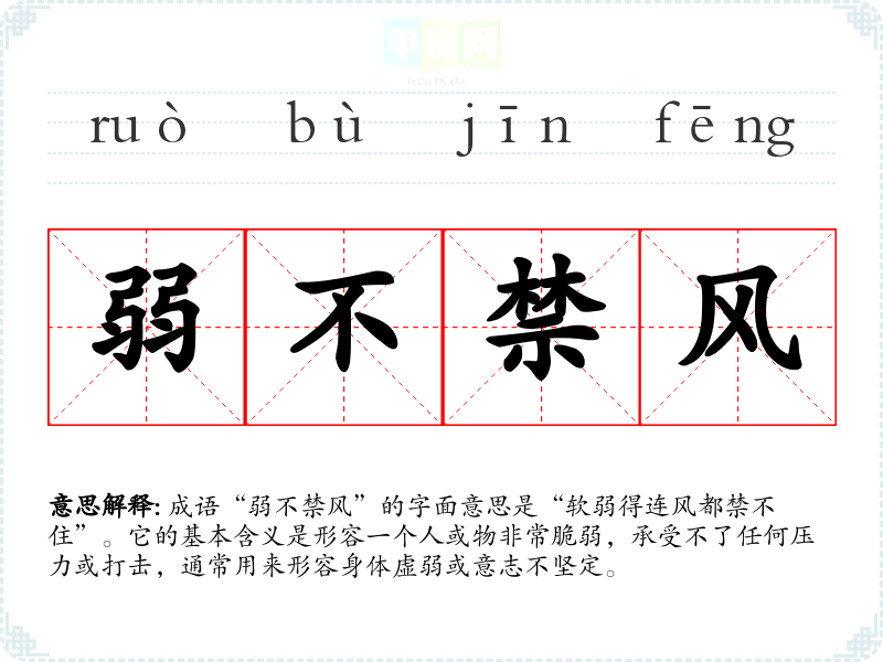 成语“弱不禁风”的字面意思是“软弱得连风都禁不住”。它的基本含义是形容一个人或物非常脆弱,承受不了任何压力或打击,通常用来形容身体虚弱或意志不坚定。