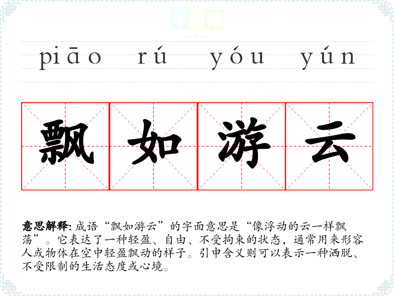 成语“飘如游云”的字面意思是“像浮动的云一样飘荡”。它表达了一种轻盈、自由、不受拘束的状态,通常用来形容人或物体在空中轻盈飘动的样子。引申含义则可以表示一种洒脱、不受限制的生活态度或心境。